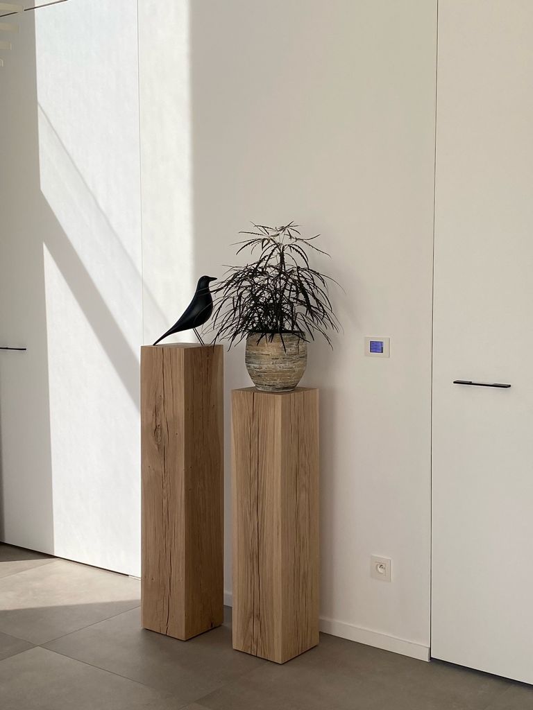 Deze vraag krijgen we vaak! Een massief eiken sokkel is veel zwaarder dan een (holle) eiken fineer sokkel. Het voordeel van een zware sokkel is dat het stevig staat en meer gewicht kan dragen. Het voordeel van een zuil uit plaatmateriaal, zoals de eiken fineer zuil, is dat het lichter van gewicht is, en daardoor gemakkelijker te verplaatsen is.