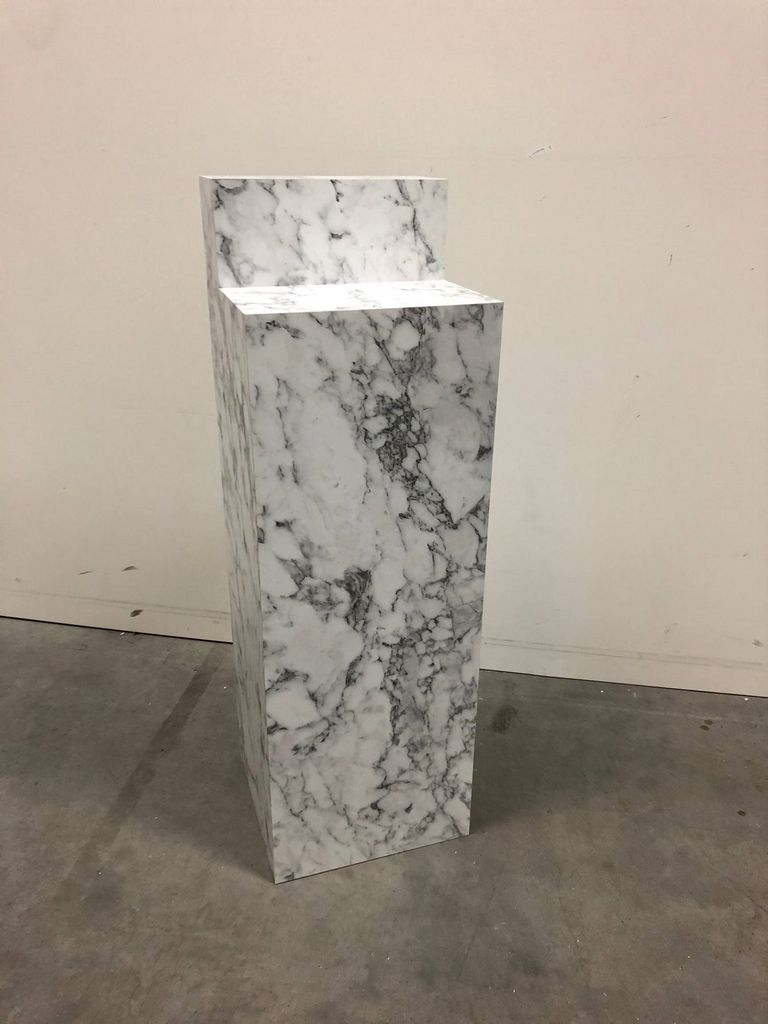 Deze sokkel is op maat gemaakt voor een van onze klanten. Meer en meer klanten vragen om sokkels van marmerlook. De sokkel wordt gemaakt van een plaatmateriaal voorzien van een marmerlook HPL, een stevig materiaal. Omdat het niet uit echt marmer is vervaardigd, zijn alle afmetingen mogelijk en is de sokkel minder zwaar en minder kostbaar.